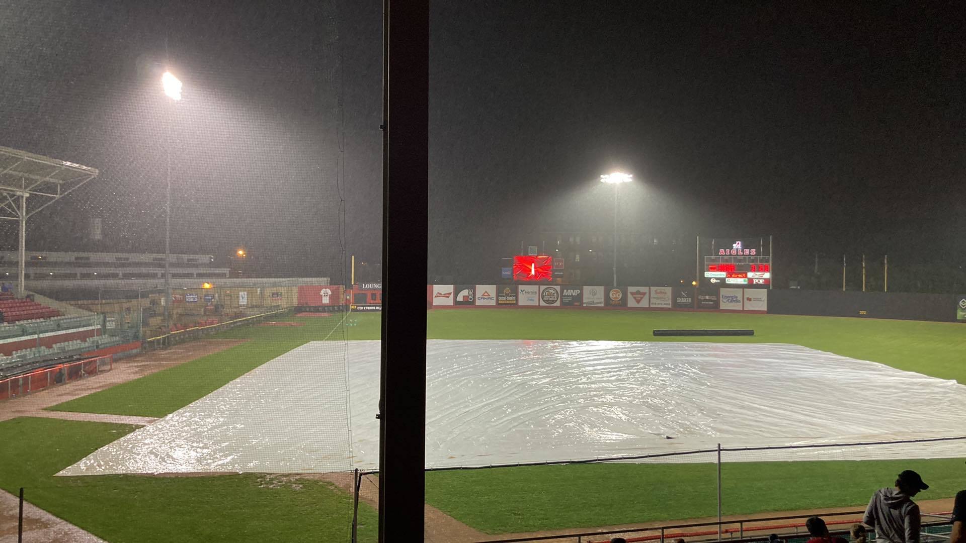 Les Aigles avaient placé un coureur au deuxième but en 7e manche, tandis que la pluie tombait déjà abondamment. Raphaël Gladu s’amenait à la plaque lorsque les visiteurs se sont réunis au monticule. Les joueurs d’avant-champ, et le lanceur, ont d’abord pris du temps pour retirer la terre de leurs crampons, puis le lanceur des Capitales a effectué plusieurs demandes de changement de balle envers l’arbitre, la pluie était trop persistante.